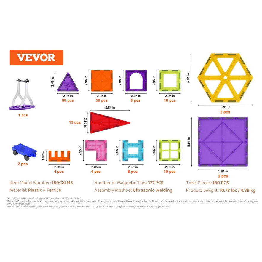 Discover the world of creativity with the VEVOR 180PCS Magnetic Tile Building Set. This educational construction toy is designed to inspire young minds and keep them engaged for hours on end. Perfect for birthdays or any special occasion, this set is not just a toy; it's a tool for learning and fun!